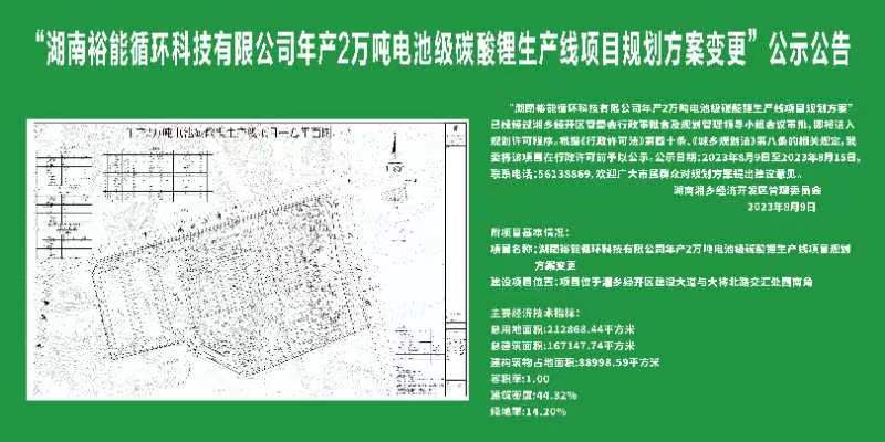 湖南裕能循環科技有限公司年產2萬噸電池級碳酸鋰生產線項目規劃方案變更” 公示公告