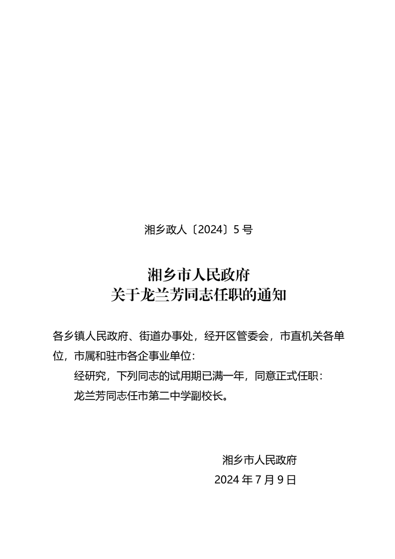 湘鄉政人〔2024〕5號 關于龍蘭芳同志任職的通知