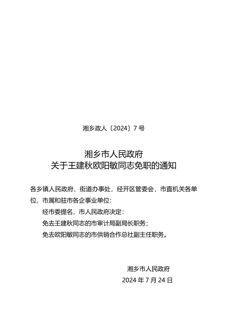 湘鄉(xiāng)政人〔2024〕7號 關于王建秋歐陽敏同志免職的通知