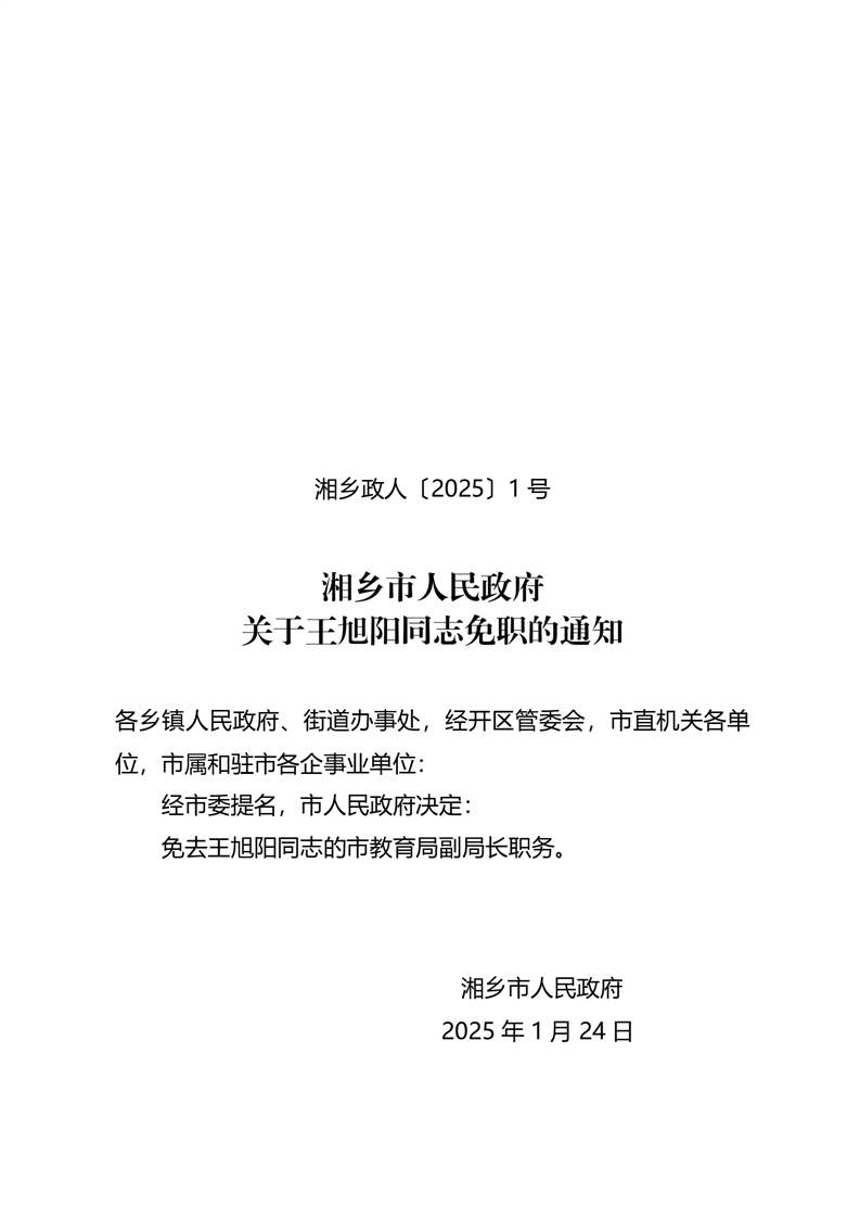 湘鄉政人〔2025〕1號 關于王旭陽同志免職的通知