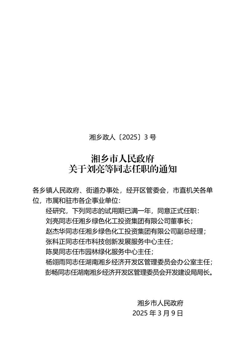 湘鄉政人〔2025〕3號 關于劉亮等同志任職的通知