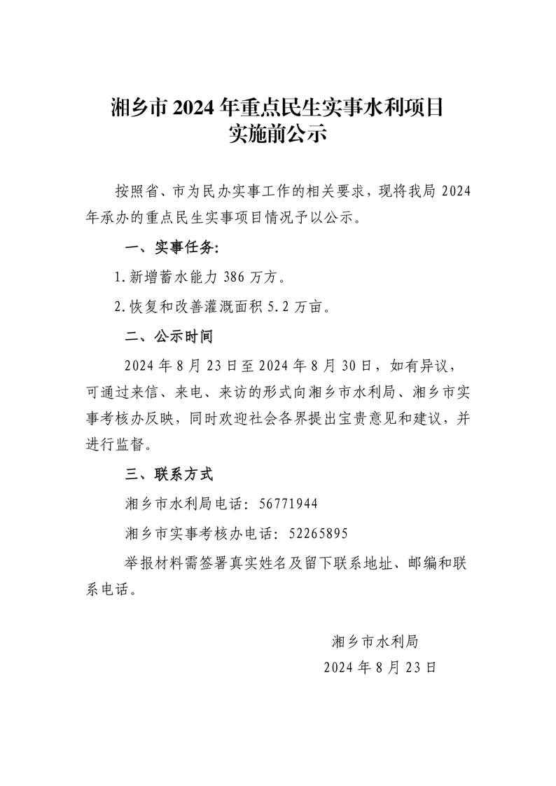 湘鄉(xiāng)市2024年重點民生實事水利項目實施前公示