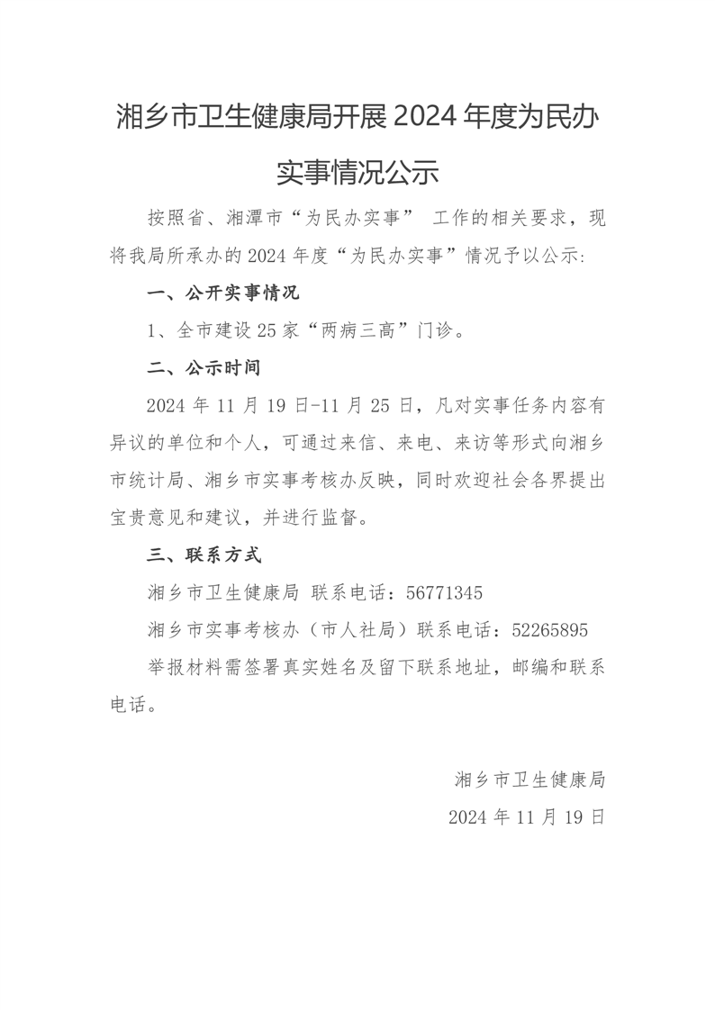 湘鄉市衛生健康局開展2024年度為民辦實事情況公示