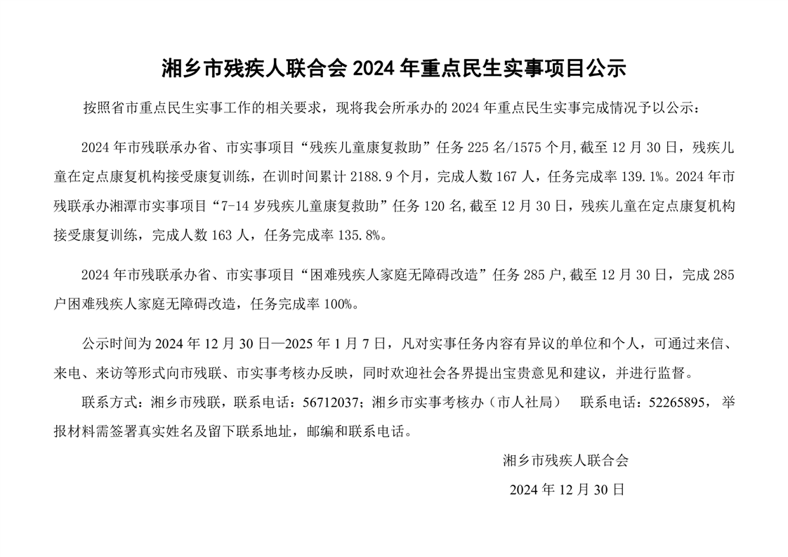 湘鄉市殘疾人聯合會2024年重點民生實事項目公示