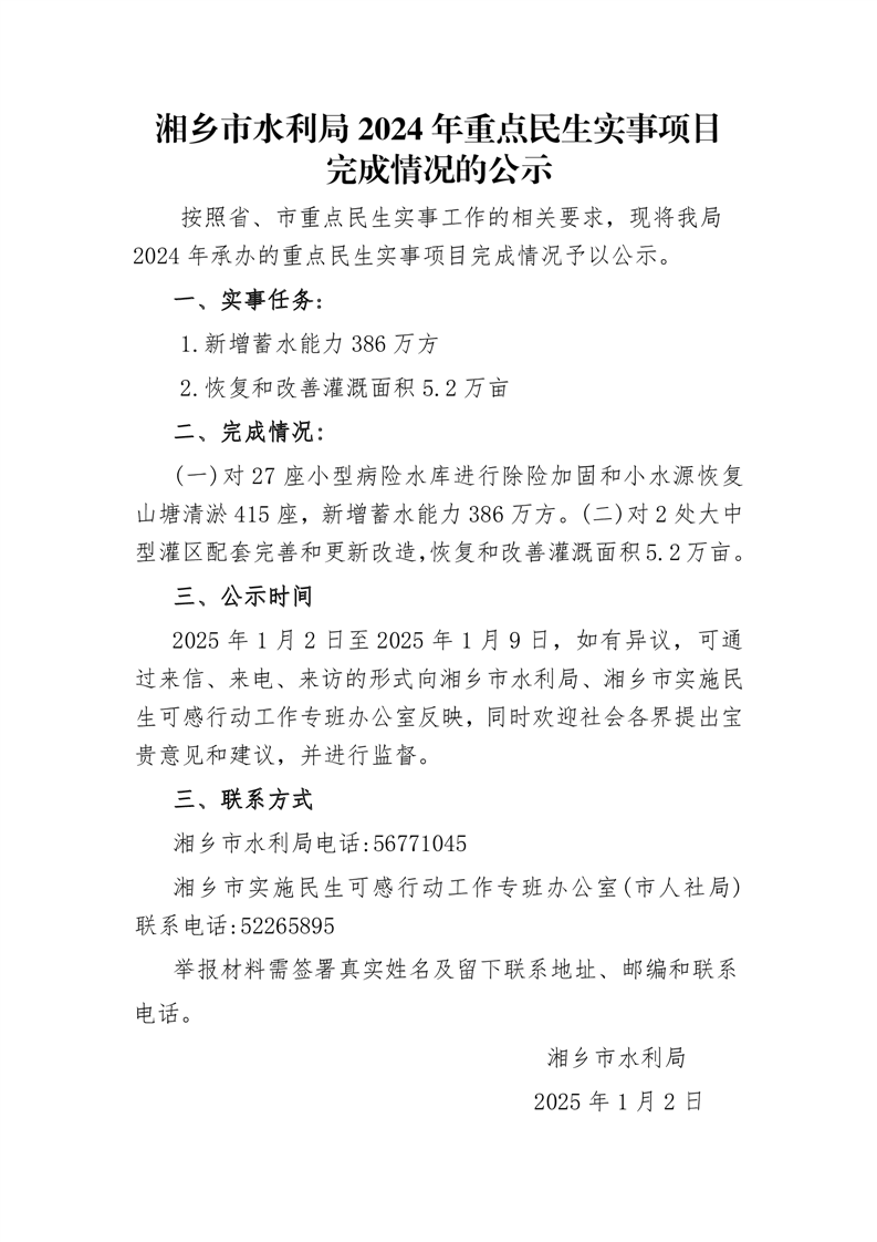 湘鄉市水利局2024年重點民生實事項目 完成情況的公示