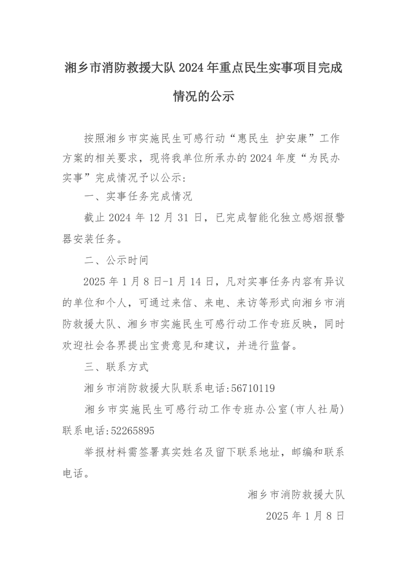湘鄉(xiāng)市消防救援大隊(duì)2024年重點(diǎn)民生實(shí)事項(xiàng)目完成情況的公示