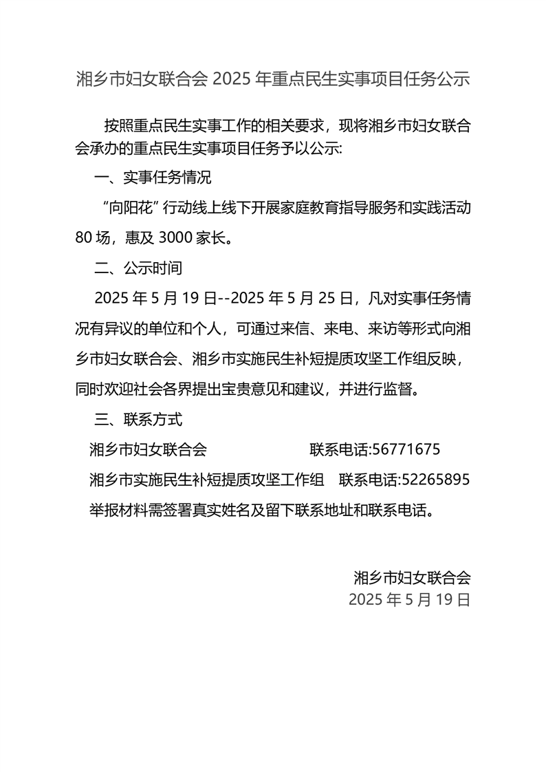 湘鄉(xiāng)市婦女聯(lián)合會(huì)2025年重點(diǎn)民生實(shí)事項(xiàng)目任務(wù)公示