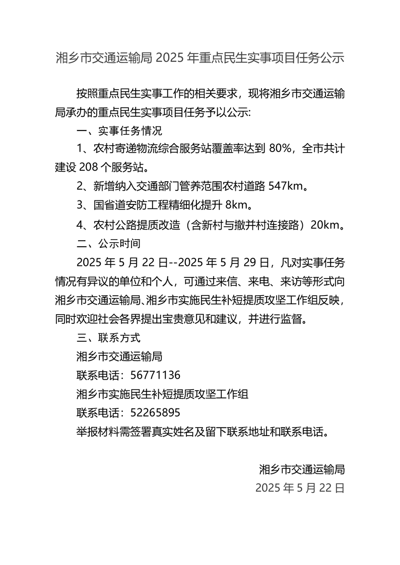 湘鄉市交通運輸局2025年重點民生實事項目任務公示