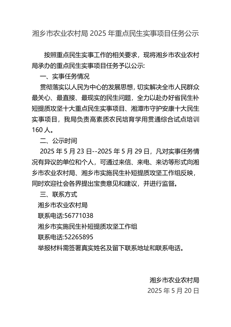 湘鄉市農業農村局2025年重點民生實事項目任務公示