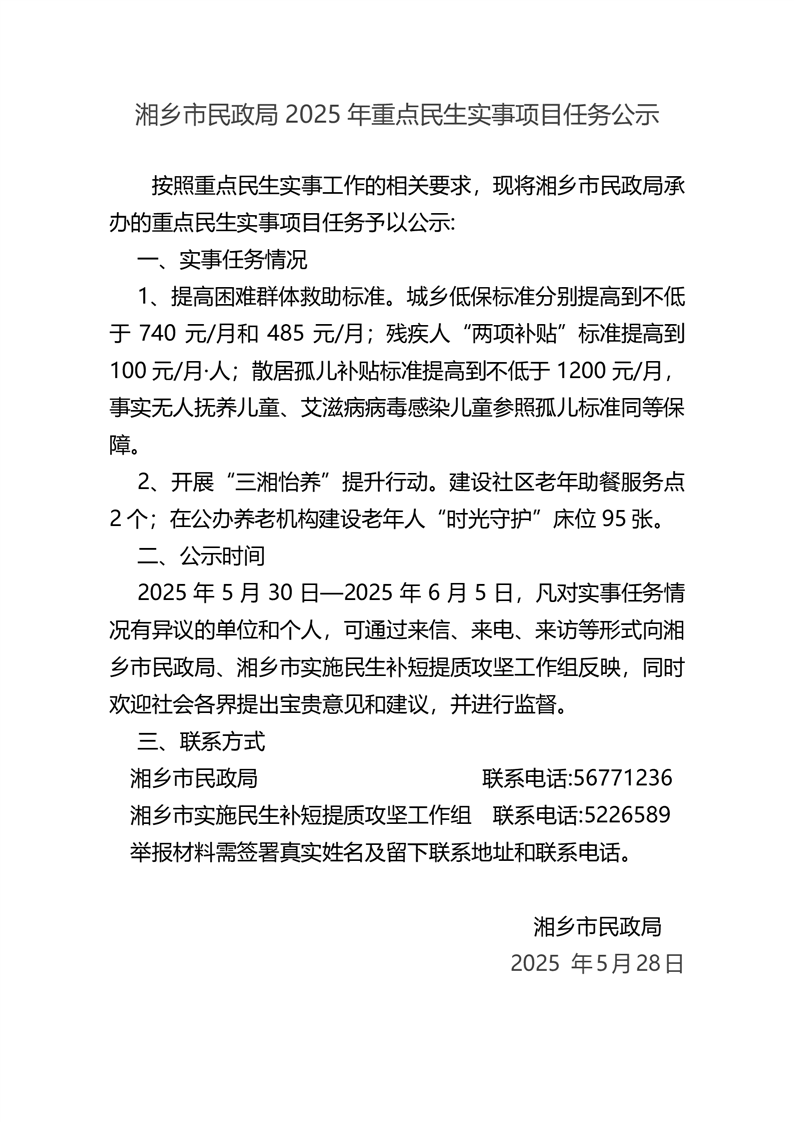 湘鄉市民政局2025年重點民生實事項目任務公示