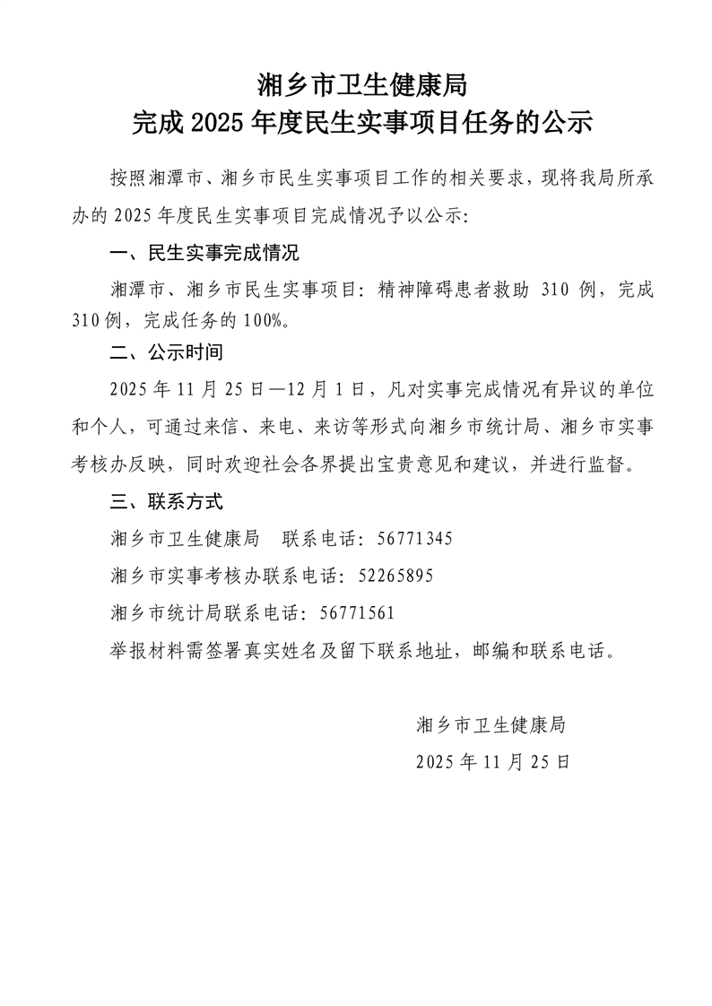 湘鄉(xiāng)市衛(wèi)生健康局完成2025年度民生實(shí)事項(xiàng)目任務(wù)的公示