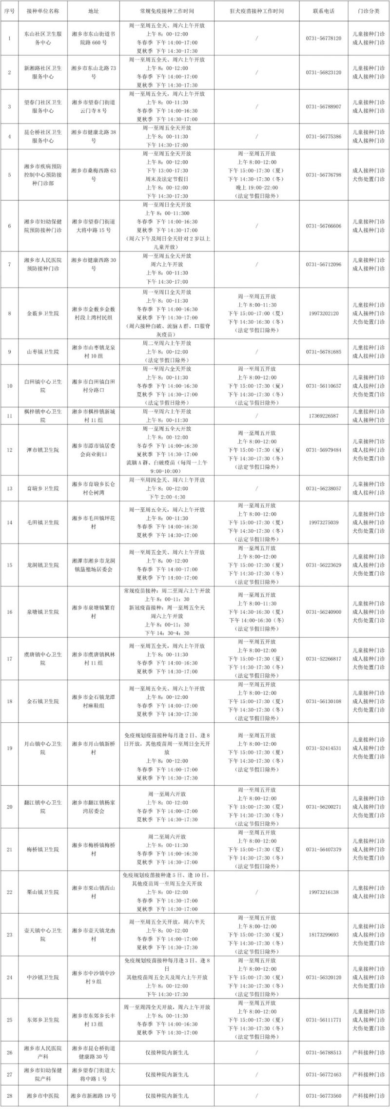 湘鄉市2023年疫苗接種單位信息公示