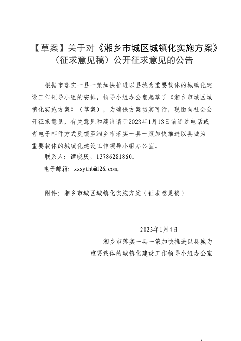 關(guān)于對《湘鄉(xiāng)市城區(qū)城鎮(zhèn)化實施方案》(征求意見稿)公開征求意見的公告