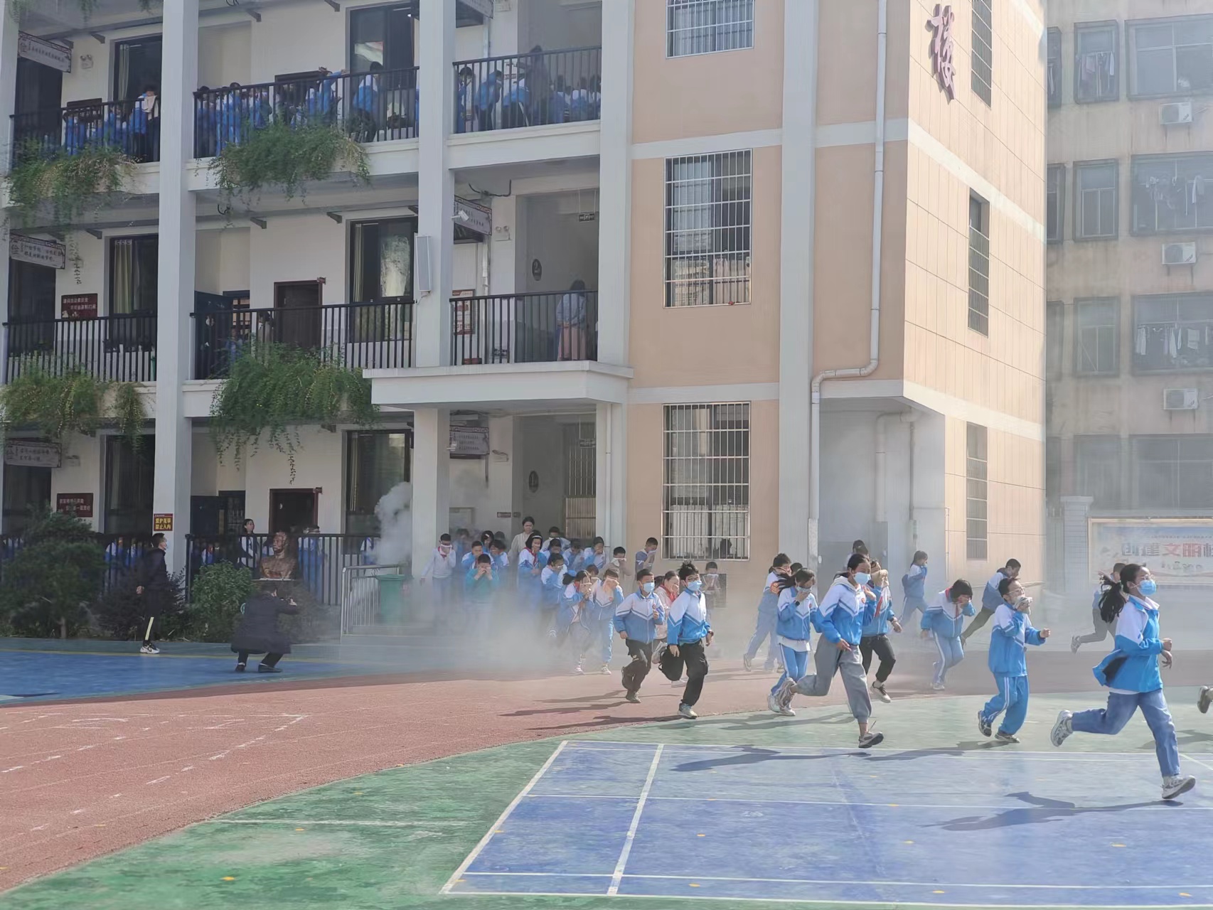 演練現場,隨著消防警報的響起,在班主任和任課老師的組織下,同學們按指定路線,捂住口、鼻,彎著腰,迅速有序地進行緊急疏散,師生們全部撤離到了安全地點。整個演練過程井然有序,達到了預期效果。