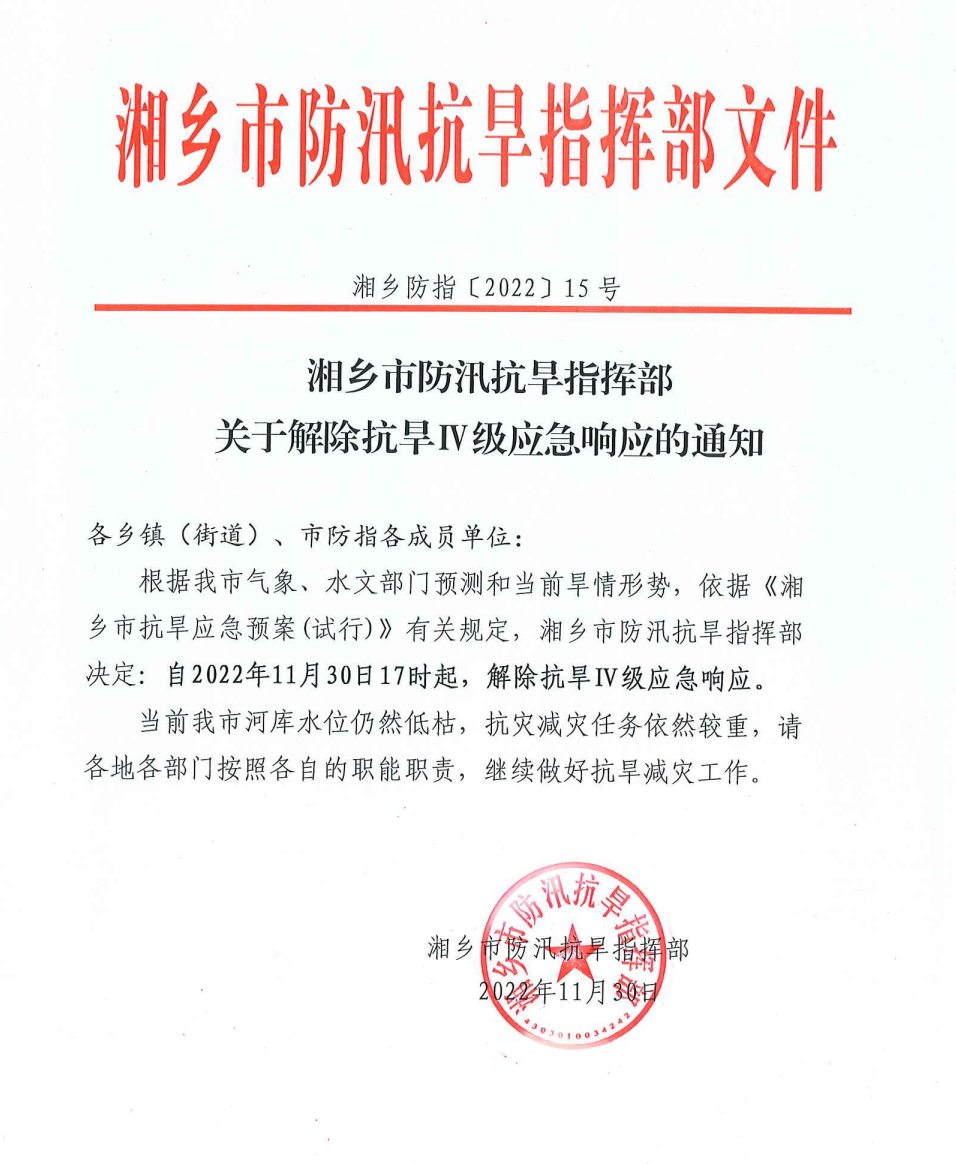 湘鄉市防汛抗旱指揮部關于解除抗旱IV級應急響應的通知