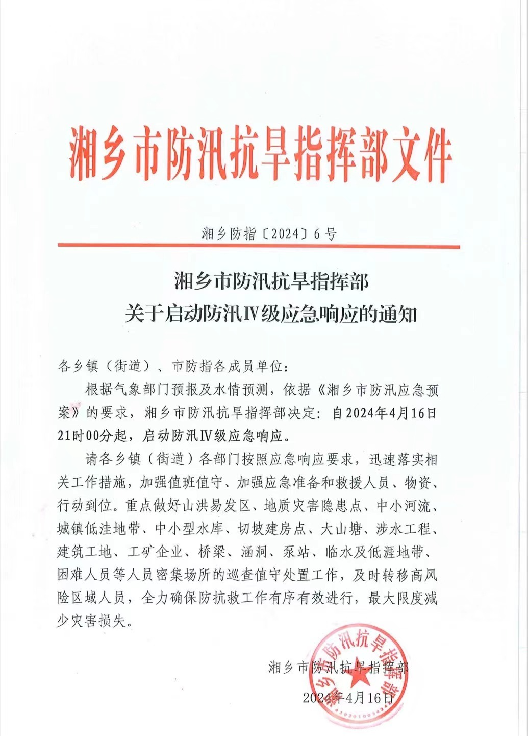 湘鄉市防汛抗旱指揮部關于啟動防汛Ⅳ級應急響應的通知
