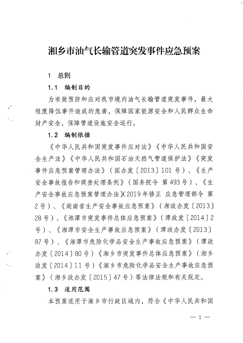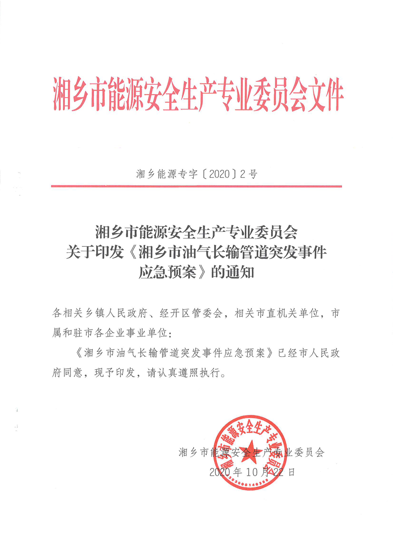湘鄉(xiāng)市能源安全生產(chǎn)專業(yè)委員會關(guān)于印發(fā)《湘鄉(xiāng)市油氣長輸管道突發(fā)事件應(yīng)急預(yù)案》的通知
