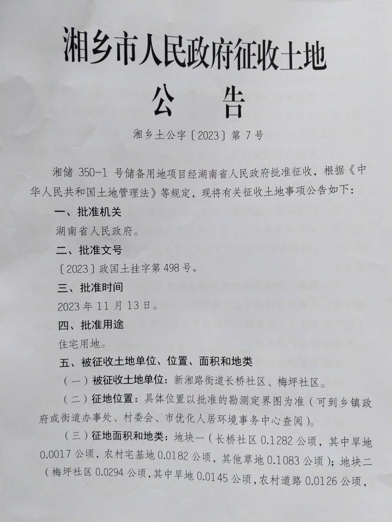湘鄉(xiāng)市人民政府征收土地公告(湘鄉(xiāng)土公字【2023】第7號(hào))