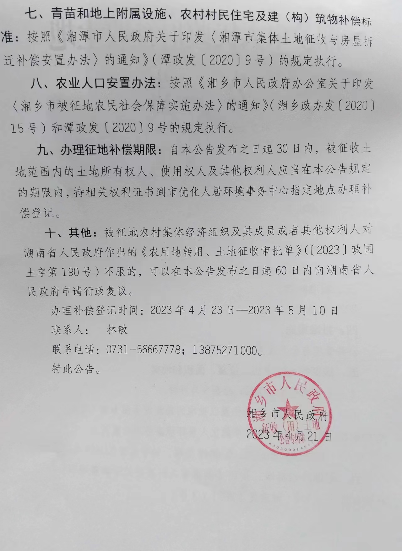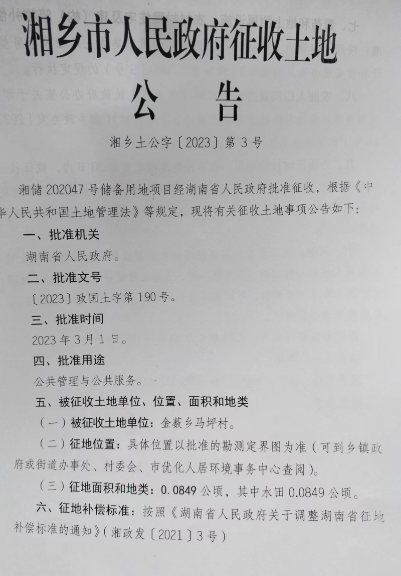 湘鄉市人民政府征收土地公告(湘鄉土公字【2023】第3號)