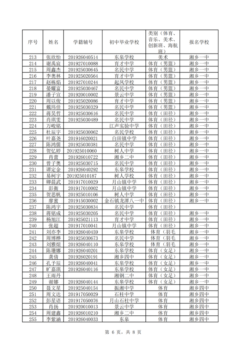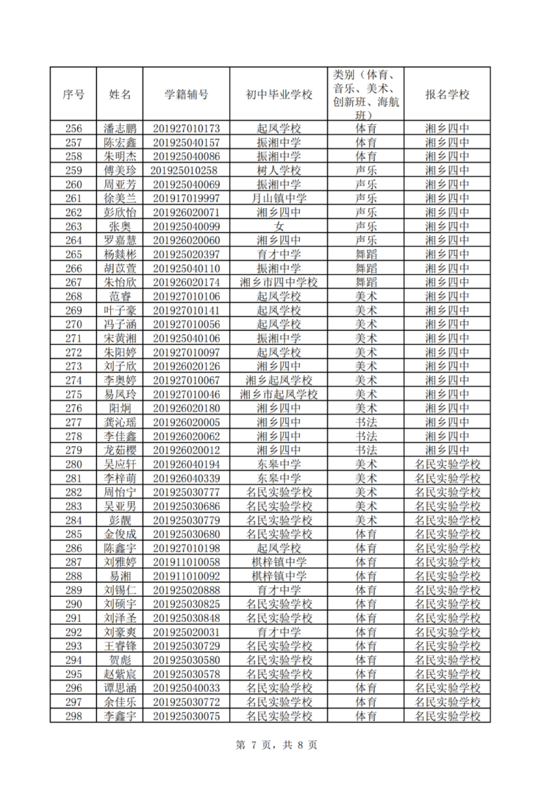 湘鄉市2023年普通高中自主招生公示表