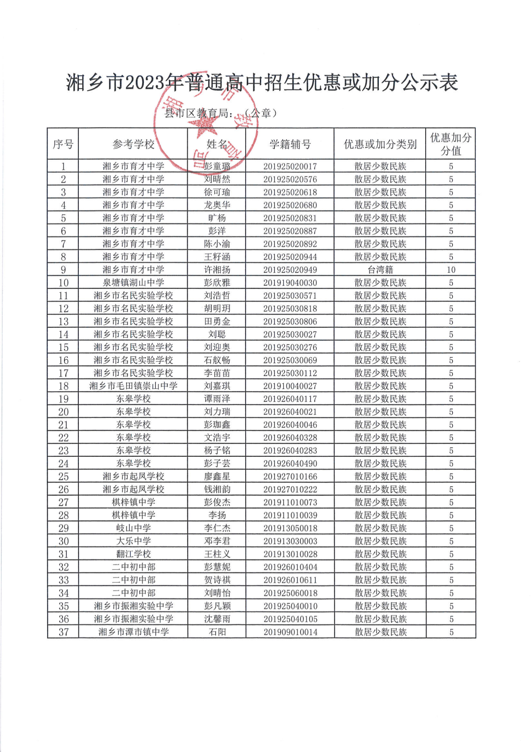 湘鄉市2023年普通高中招生優惠或加分公示表