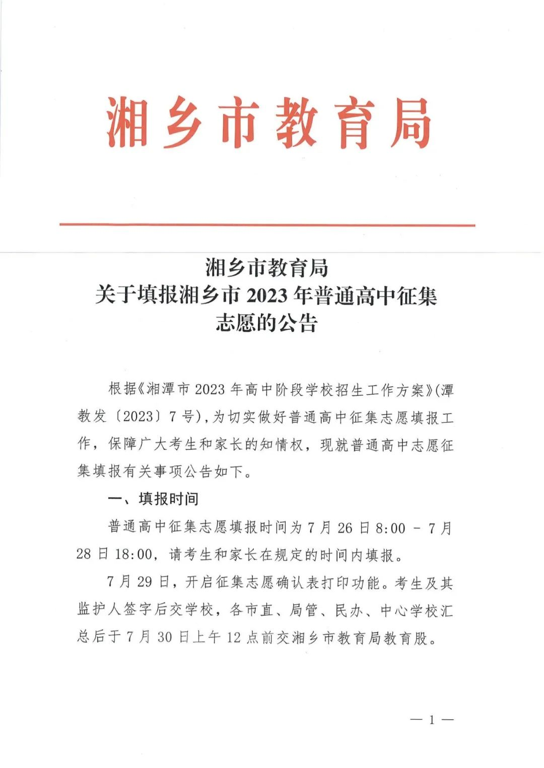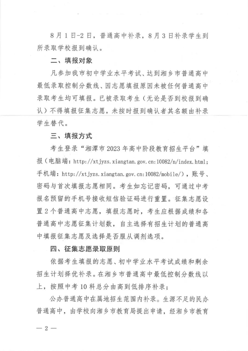 湘鄉市教育局關于填報湘鄉市2023年普通高中征集志愿的公告