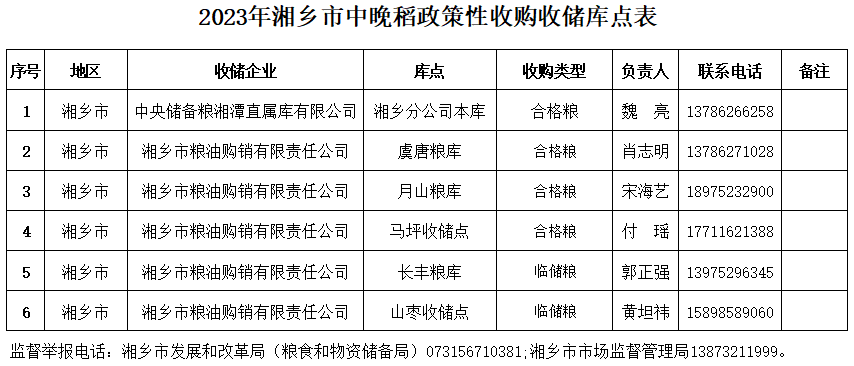 關于公布湘鄉市2023年中晚稻政策性收購收儲庫點的公告