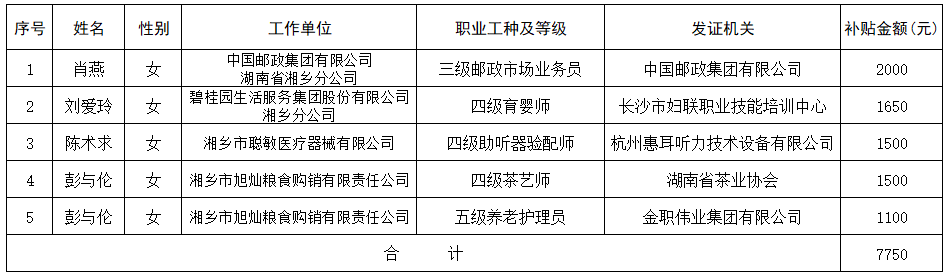 湘鄉市2024年9月失業保險技能提升補貼公示表