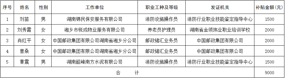 湘鄉市2025年6月失業保險技能提升補貼公示表