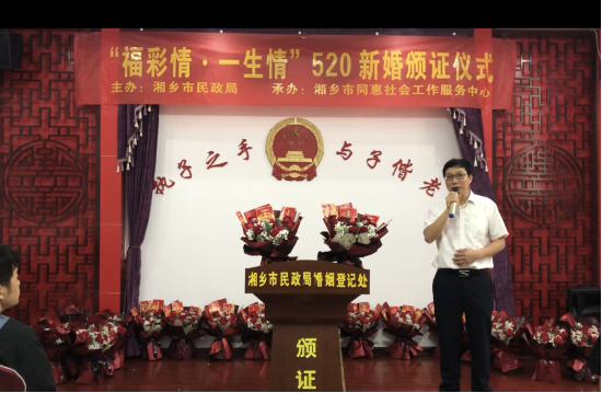 5月20日,一個因數字諧音“我愛你”而變得特殊的日子里湘鄉市民政局精心策劃了“福彩情·一生情”520新人集體頒證儀式。現場鮮花、氣球、彩帶交織成一幅美麗的畫卷,讓30對新人參與者感受到了前所未有的喜慶氛圍。
