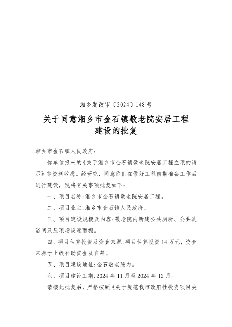 關于同意湘鄉市金石鎮敬老院安居工程建設的批復