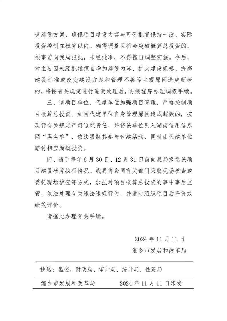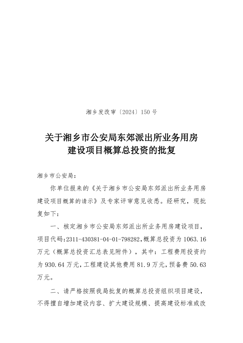 關于湘鄉市公安局東郊派出所業務用房建設項目概算總投資的批復