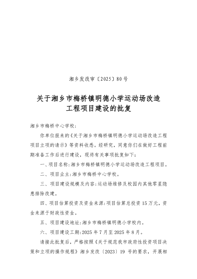 關(guān)于湘鄉(xiāng)市梅橋鎮(zhèn)明德小學(xué)運(yùn)動(dòng)場(chǎng)改造工程項(xiàng)目建設(shè)的批復(fù)