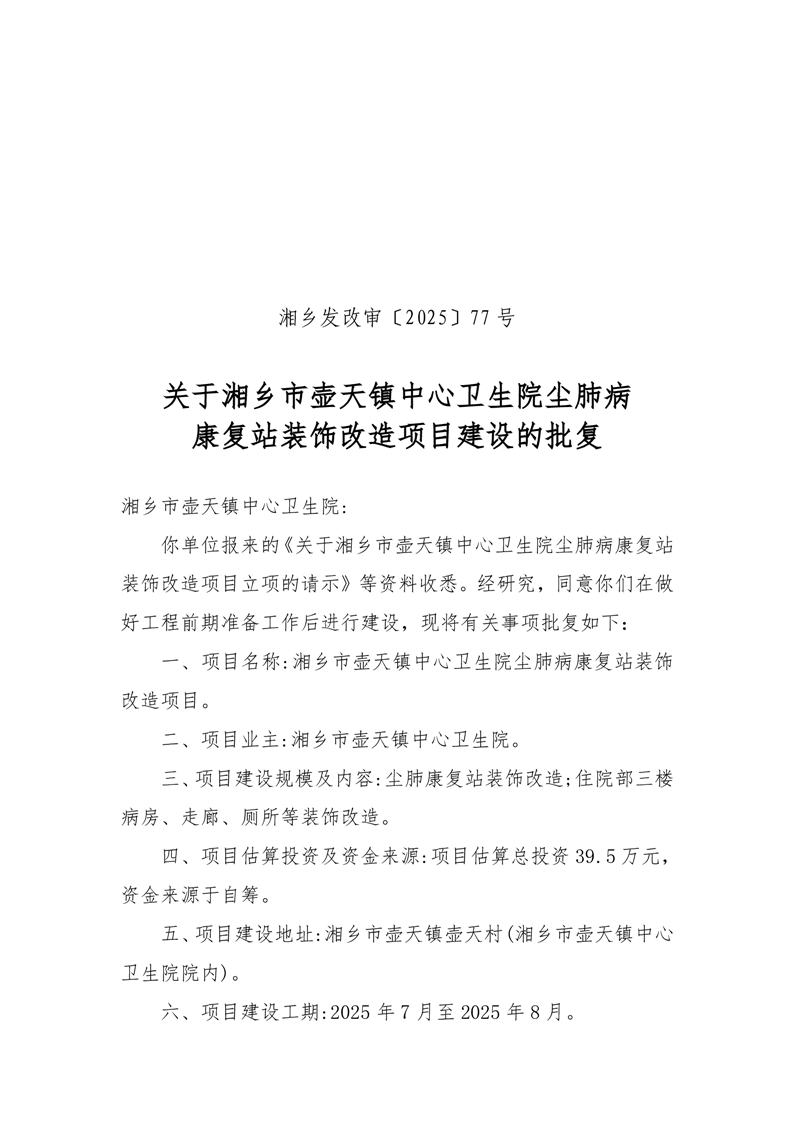 關于湘鄉市壺天鎮中心衛生院塵肺病康復站裝飾改造項目建設的批復