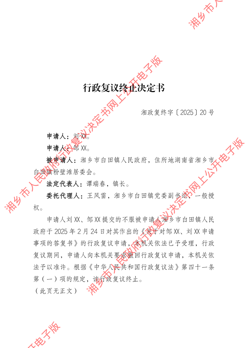 湘政復終字〔2025〕20號《行政復議終止決定書》