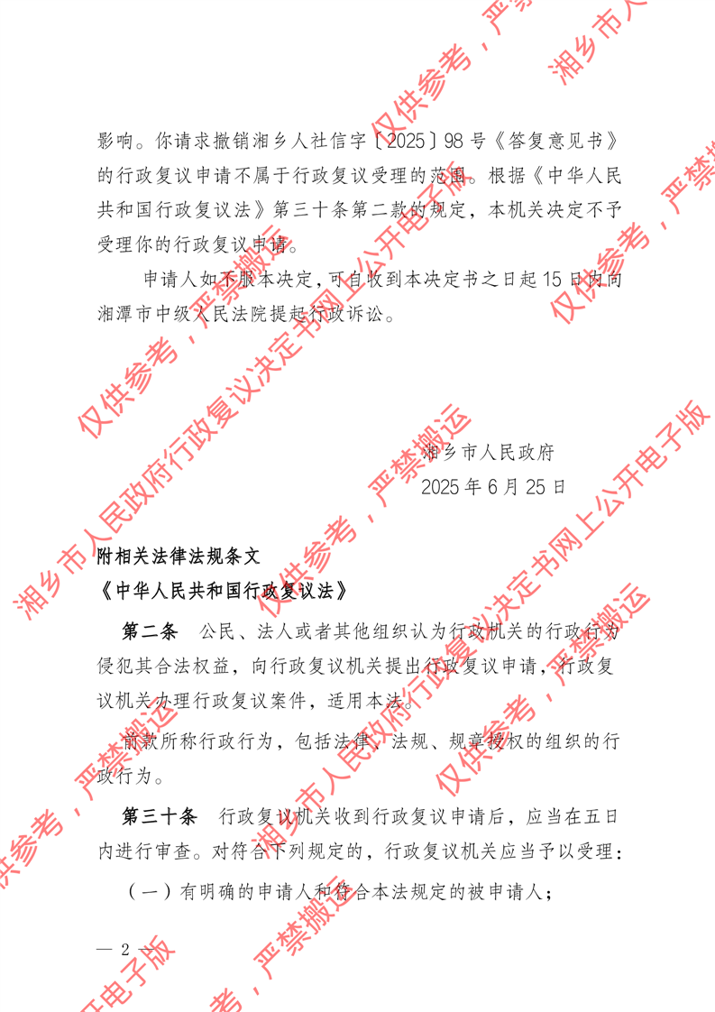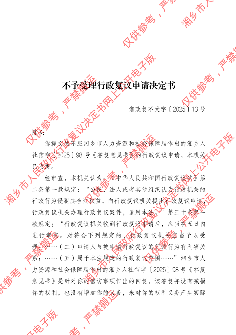 湘政復不受字〔2025〕13號《不予受理行政復議申請決定書》