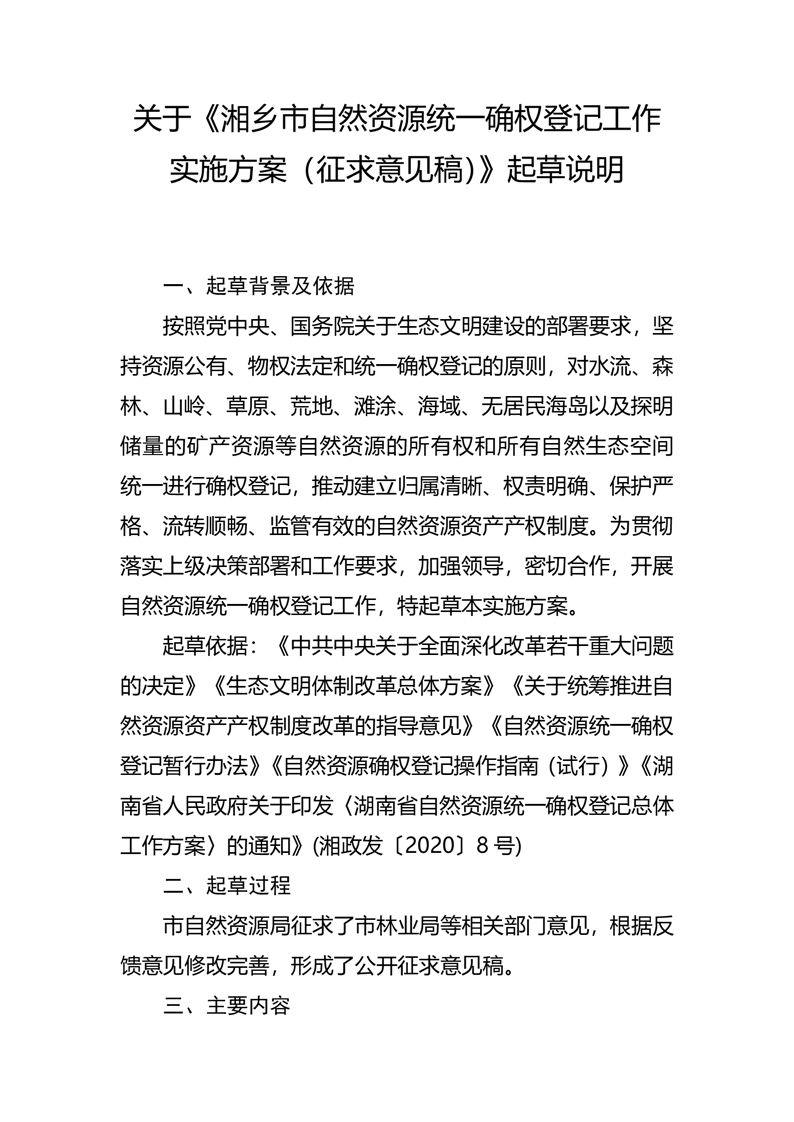 關于《湘鄉市自然資源統一確權登記工作 實施方案(征求意見稿)》起草說明