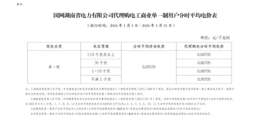2024年1月代理購電工商業單一制用戶分時平均電價表