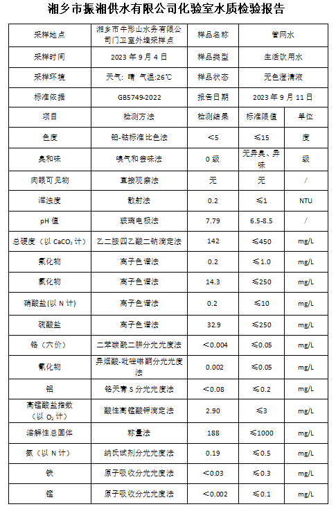 2023年9月湘鄉市振湘供水有限公司化驗室水質檢驗報告