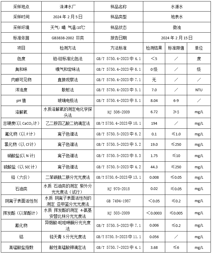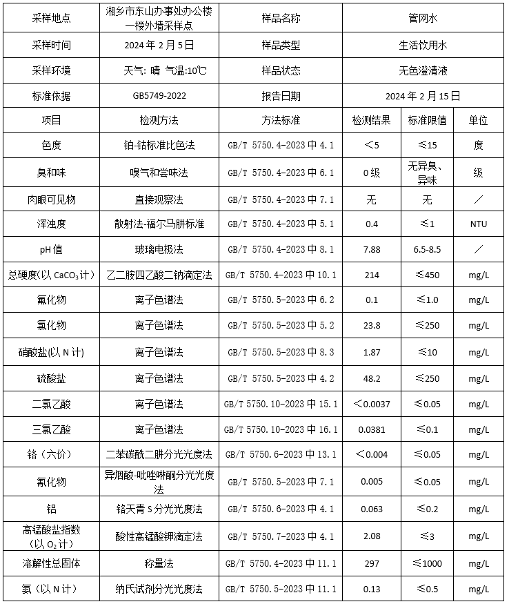 2024年2月湘鄉市振湘供水有限公司化驗室水質檢驗報告