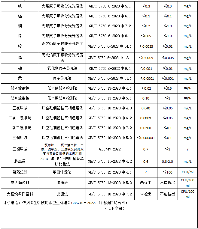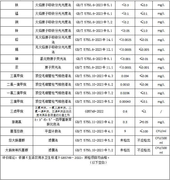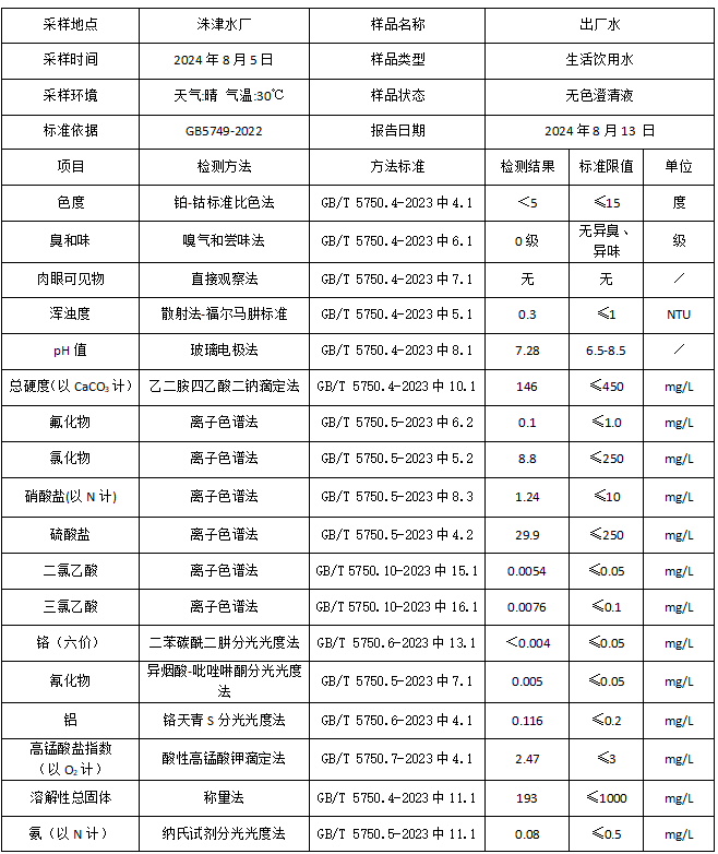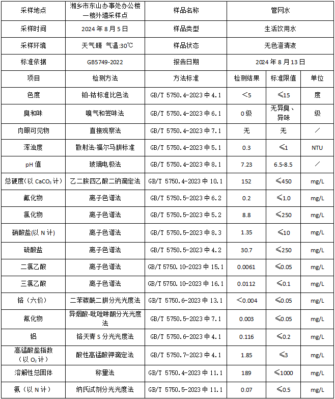 2024年8月湘鄉市振湘供水有限公司化驗室水質檢驗報告