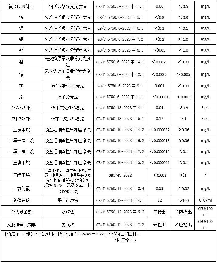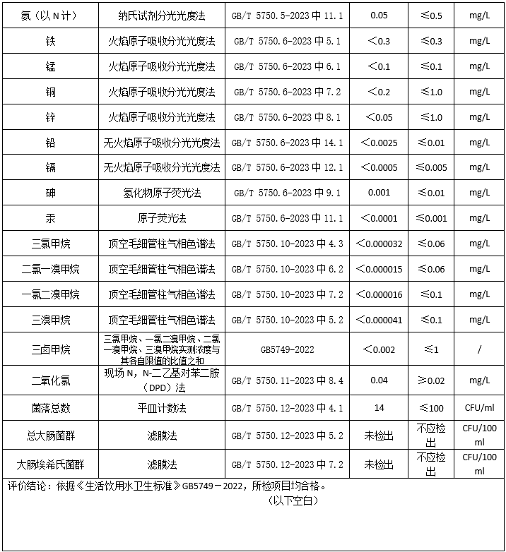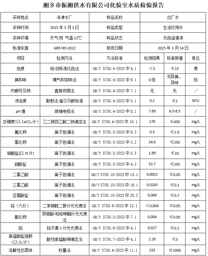2025年3月湘鄉市振湘供水有限公司化驗室水質檢驗報告