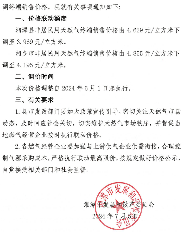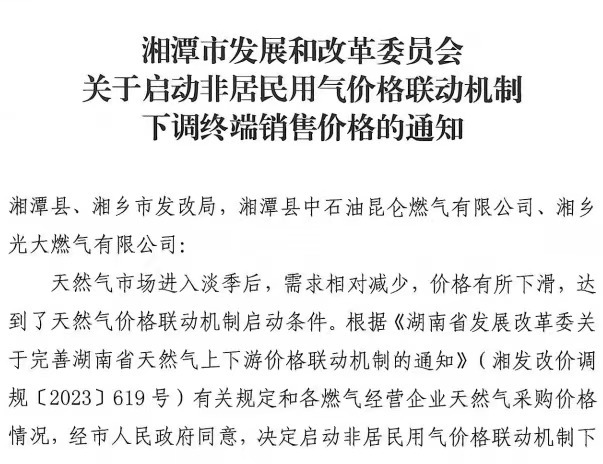 湘潭市發展和改革委員會關于啟動非居民用氣價格聯動機制下調終端銷售價格的通知