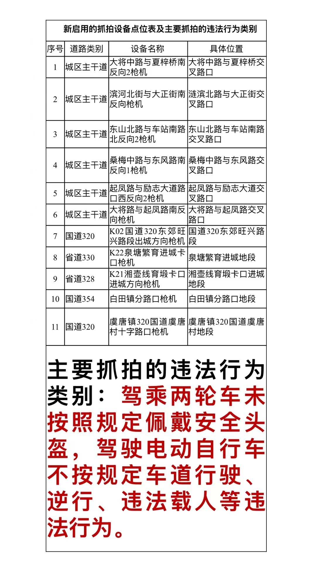 根據有關規定,現將啟用的設備予以公示,具體點位及主要抓拍的違法行為公示如下(詳見下表),自2025年7月18將正式啟用這批設備開展非現場違法線索采集。