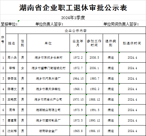 湘鄉(xiāng)市2024因病完全喪失勞動能力提前退休擬通過人員公示