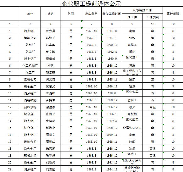 現將擬辦理(特殊工種/非因工傷殘或因病完全喪失勞動能力)提前退休人員基本情況予以公示,公示時間5個工作日(2024年10月25日至2024年10月31日)。如有異議,請在公示期內向湘鄉市人力資源和社會保障局(舉報電話:0731-52265582)反映。