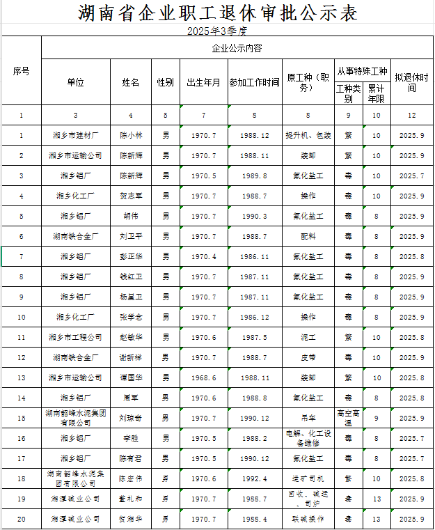 現將擬辦理特殊工種提前退休人員基本情況予以公示,公示時間5個工作日2025918日至2025924日)。如有異議,請在公示期內向湘鄉市人力資源和社會保障局(舉報電話:0731-52265582)反映。