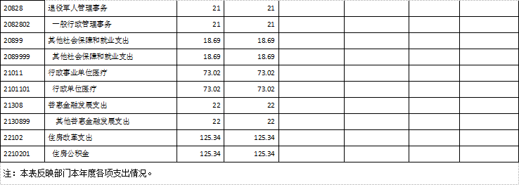 2021年度財政撥款支出2289.58萬元,主要用于以下方面:社會保障和就業支出2069.22萬元,占90.38%;衛生健康支出支出73.02萬元,占3.19%;住房保障支出125.34萬元,占5.47%;農林水支出22萬元,占0.96%。