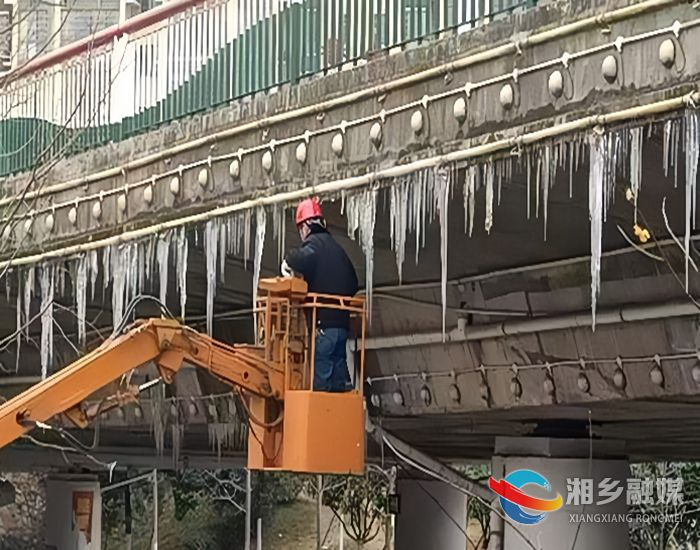 市城管執(zhí)法局市政設(shè)施維護(hù)中心立即組織人員趕赴現(xiàn)場(chǎng)勘察,并及時(shí)開展“碎冰行動(dòng)”。工作人員在橋下設(shè)置警示標(biāo)志,清空附近行人、車輛,確保過往行人車輛安全。除冰時(shí)由人工配合高空作業(yè)車,使用除冰桿將冰錐敲落粉碎,并安排人員及時(shí)將掉落在地的碎冰清掃干凈。