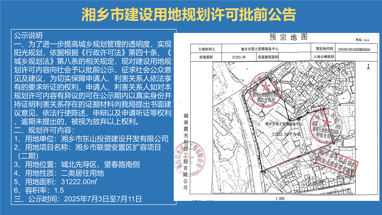 湘鄉市建設用地規劃許可批前公告(聯盟安置區擴容項目)
